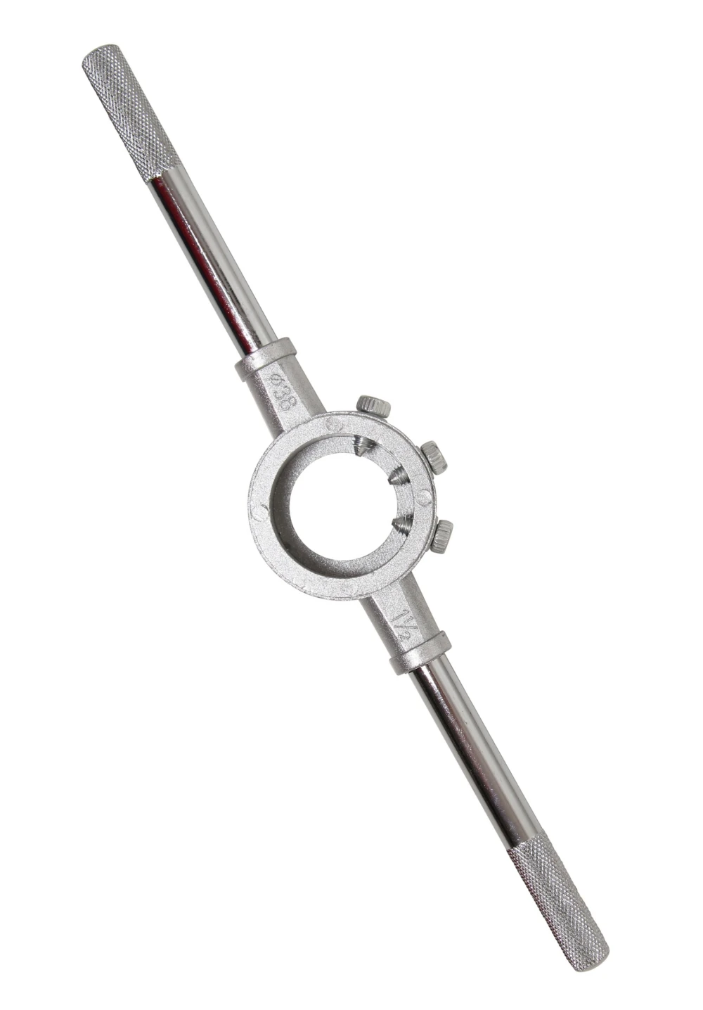 BGS 1900-4 Schneideisenhalter #5 38 x 13mm Beschreibung: zum Einspannen von Gewindeschneideisen mit Ø38mm mit Höhe 13mm abschraubbare Stahlgriffe Stahlgriffbreite: 380mm Haltekopf aus Zink-Druckguss mit 3 Spannschrauben zur Befestigung des Schneideisens am Haltekopf auch als Ersatz zu Art. 1900