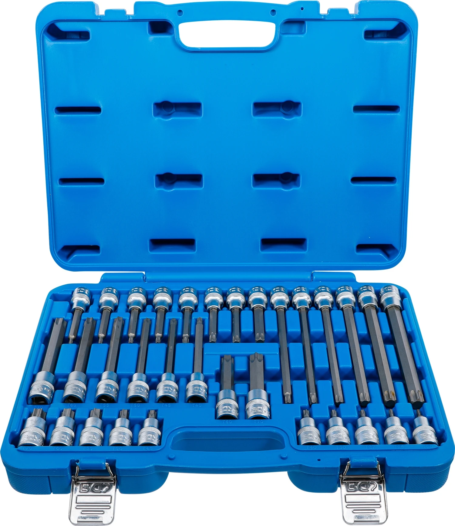 BGS 5182 Satz TORX Bit 55 100 140 200mm Länge 12,5mm (1/2") 32 teilig Beschreibung: Material: Chrom Vanadium S2 Stahl zur Verwendung mit Knarren & Drehmomentschlüssel NICHT zur Verwendung mit Schlagschraubern geeignet geliefert im Kunststoffkoffer Torx Einsätze ohne Stirnlochbohrung, daher extrem stabil Lieferumfang: Bit für Innentorx für TX Schrauben ohne Stirnlochbohrung alle Antrieb 12,5mm (1/2") je 1 x folgende Biteinsätze Länge 55mm Torx T20, Torx T25, Torx T27, Torx T30, Torx T40, Torx T45, Torx T50, Torx T55, Torx T60, Torx T70 Länge 100mm Torx T20, Torx T25, Torx T27, Torx T30, Torx T40, Torx T45, Torx T50, Torx T55, Torx T60, Torx T70 Länge 140mm Torx T40, Torx T45, Torx T50, Torx T55, Torx T60, Torx T70 Länge 200mm Torx T40, Torx T45, Torx T50, Torx T55, Torx T60, Torx T70 inkl. Aufbewahrungskasten