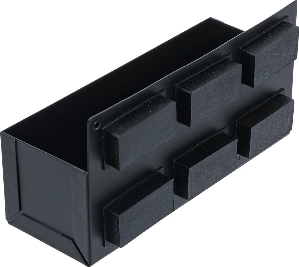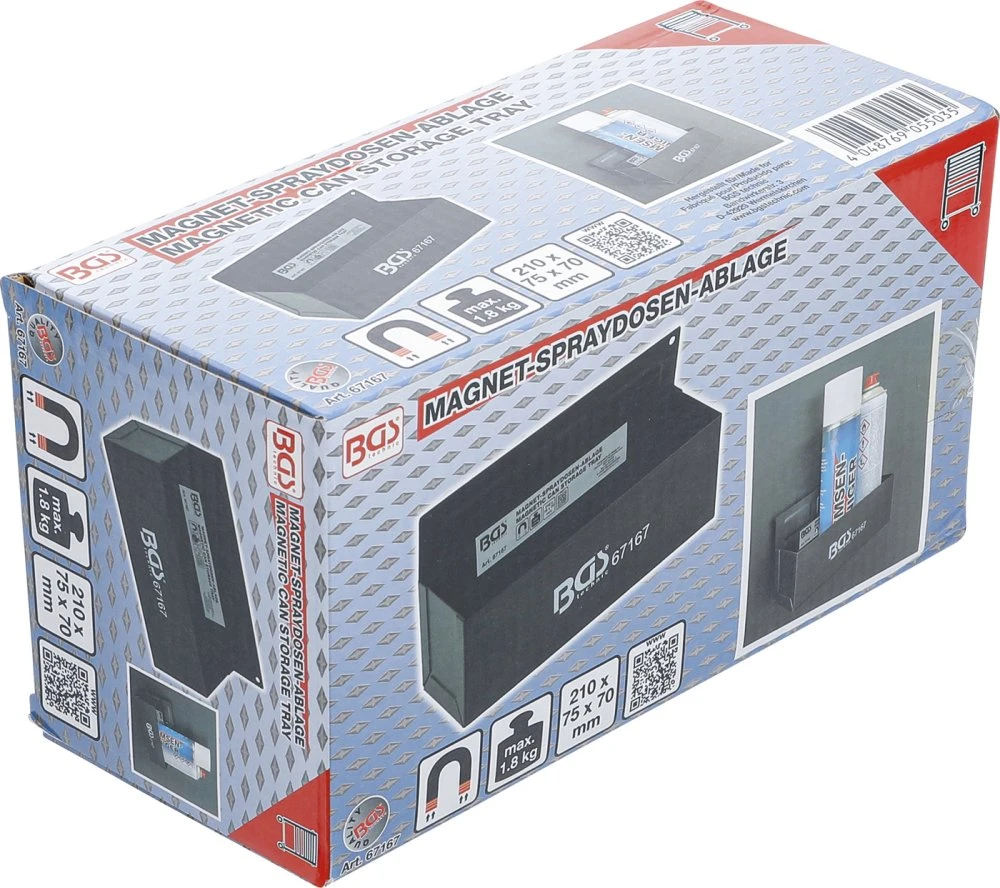 BGS 67167 Spraydosen Ablage magnetisch Breite 210mm Beschreibung: für z.B. 3 Spraydosen mit Ø 73mm 6 starke Magnete, Haltekraft ca. 1,8kg Maße Breite 210 x 75 x 70 mm leichte Montage an allen magnetischen Flächen wie z. B. Magnetwänden, Werkzeugwagen, Montagewagen etc.