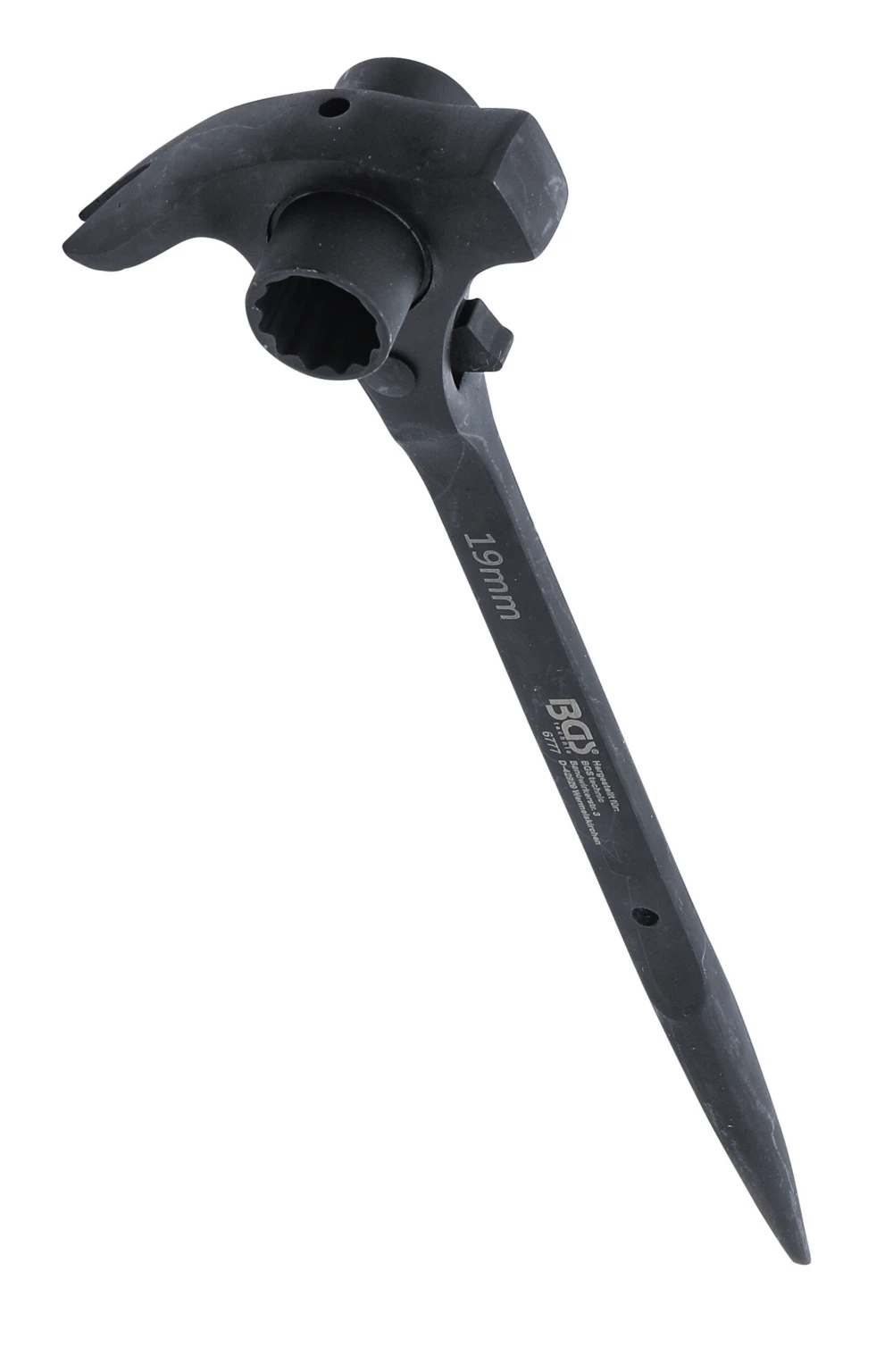 BGS 6777 Gerüstbauerknarre SW 19 x 22mm 4-in-1 Bechreibung: umschaltbare Knarre 4-in-1 mit vier Funktionen vielseitig nutzbar gesenkgeschmiedet mit Nageleisen und Hammer am Kopf Spitzkegeldorn am Griffende vielseitig einsetzbar erspart den Wechsel der Werkzeuge durch mehr Funktionen Technische Daten: Abtriebsprofil: Zwölfkant Bruttogewicht: 628g Länge: 300mm Material: Chrom-Vanadium-Stahl Schlüsselweite 1: 19mm Schlüsselweite 2: 22mm Anzahl Zähne Knarrenkopf: 24