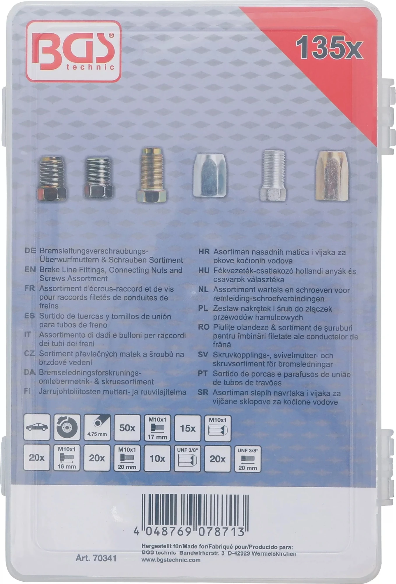 BGS 70341 Sortiment Bremsleitungsverschraubungen Überwurfmuttern Schrauben 135 teilig Beschreibung: zur individuellen Reparatur und Teilersatz von Bremsleitungen enthält die gängigsten Bremsleitungsverschraubungs- überwurfmuttern und Schrauben passend für Bremsleitungen mit Durchmesser 4,75mm Lieferumfang: 50 x Überwurfschrauben M10 x 1,0mm, Länge 16mm, abgestufter Sockel 15 x Überwurfmuttern M10 x 1,0mm 20 x Überwurfschrauben M10 x 1,0mm, Länge 16mm 20 x Überwurfschrauben M10 x 1,0mm, Länge 22mm, abgestufter Sockel 10 x Überwurfmuttern UNF 3/8" 20 x Überwurfschrauben UNF 3/8", Länge 20mm, abgestufter Sockel