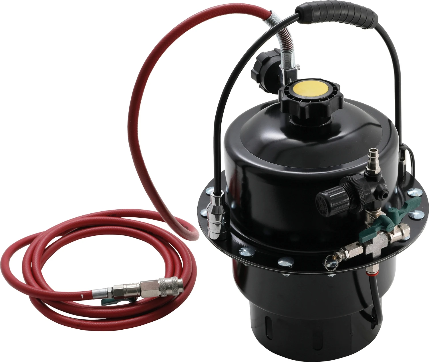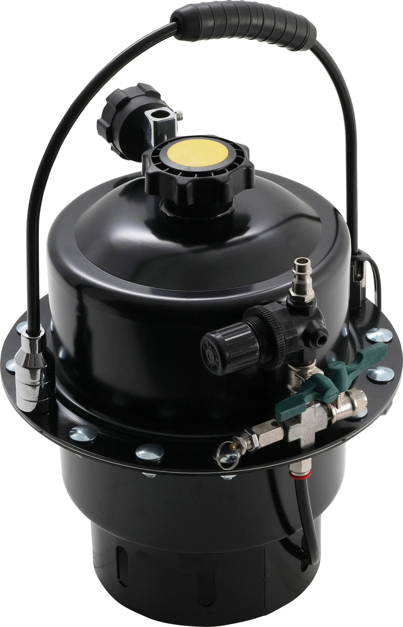 BGS 8315 Druckluft Bremsenentlüfter 0-3 bar Beschreibung: druckluftunterstütztes Entlüften von Brems- und Kupplungssystem Bremsflüssigkeit und Druckluft sind durch eine Membrane getrennt dadurch wird das Eindringen von Wasser in die Bremsflüssigkeit verhindert Arbeitsdruck lässt sich über Druckregler von 0 – 3 bar justieren und kann an der Druckuhr abgelesen werden Euro-Schnellkupplung am Befüllschlauch für leichte Montage der Adapter Anschlussschlauch mit Schnellkupplung, Länge 3,7m mit Sicherheitsventil Maße Ø 280mm, Höhe 460mm 5 Liter Bremsflüssigkeitsbehälter enthält einen Adapter E20 für die gebräuchlichsten Bremssysteme Hierzu erhältlich: 8315-3 Ersatz-Gummimembran 8315-4 Ersatzschlauch mit Schnellkupplung 8316 Adapter-Satz für Audi BMW Ford Honda Nissan Opel VW 9152 Adapter-Satz für Druckluft Bremsenentlüfter Werkstattwageneinlage 1/3