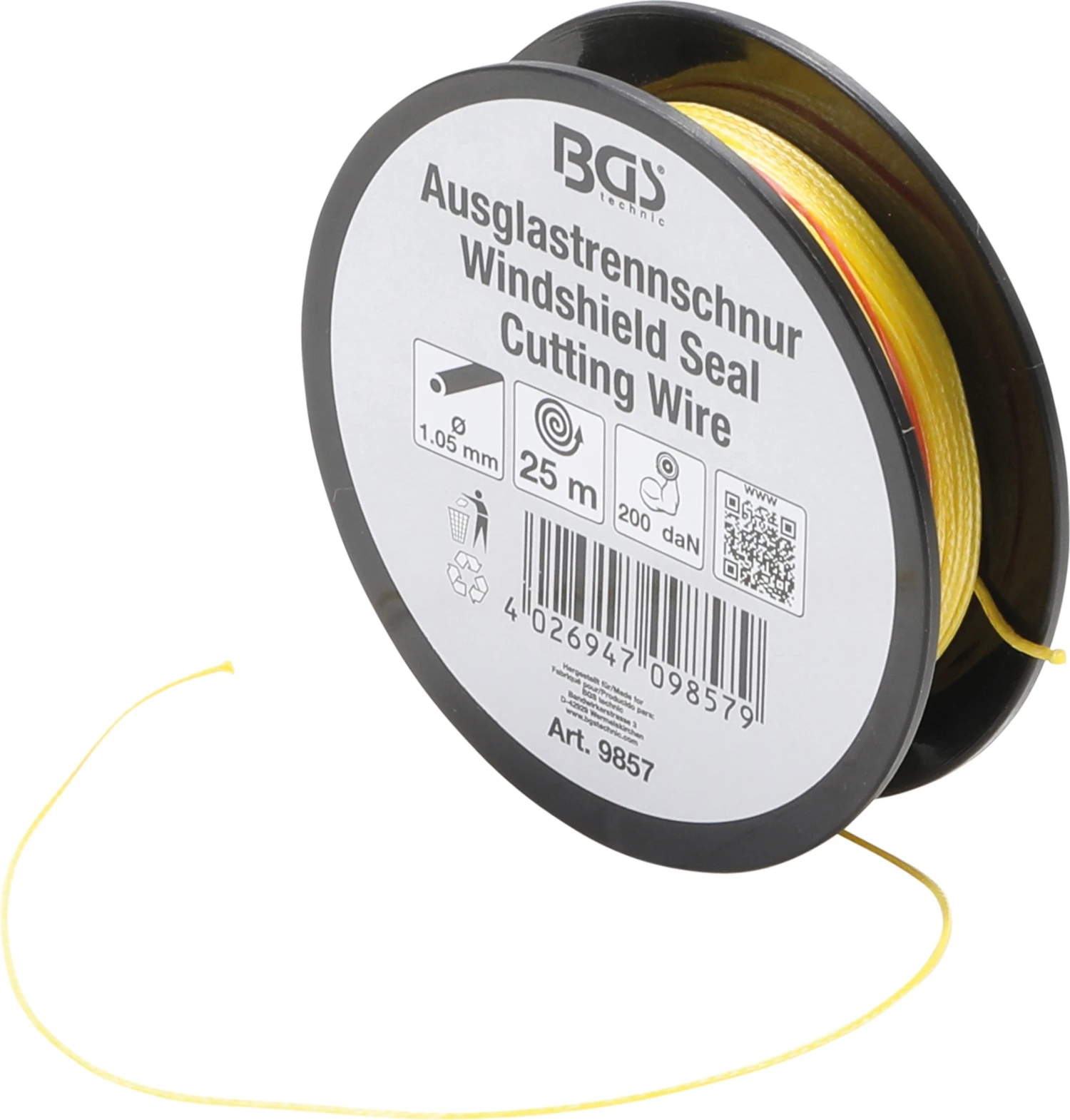 BGS 9857 Ausglas Trennschnur aus Synthetikfaser 25 Meter 200 daN Beschreibung: Material: Synthetikfaser zum beschädigungsfreien Austrennen geklebter Fahrzeugscheiben sehr gute Schneidleistung, vergleichbar mit herkömmlichen Metall-Schneiddrähten weich und flexibel, verhindert Beschädigungen an Lack und empfindlichen Oberflächen Länge: 25 Meter Durchmesser: Ø1,05mm Spezialgewebe mit extrem hoher Zugfestigkeit von 200 daN passender Ersatzdraht für z.B. Art. 6666, 69500, 69505, 8003, 8004, 8022 und anderer Werkzeuge zum Ziehen