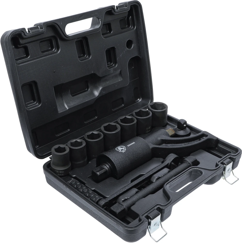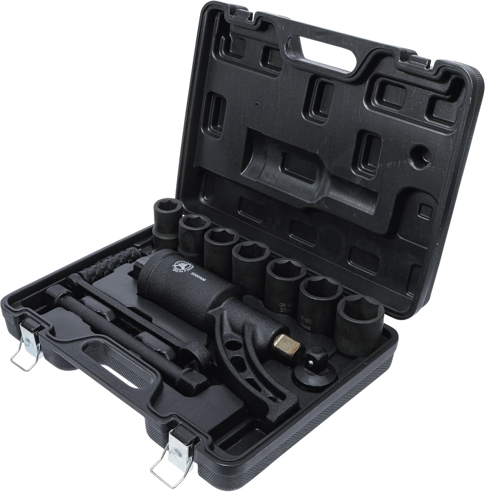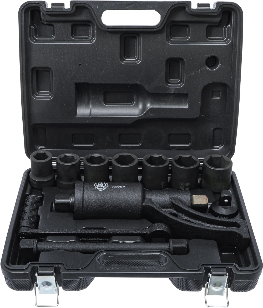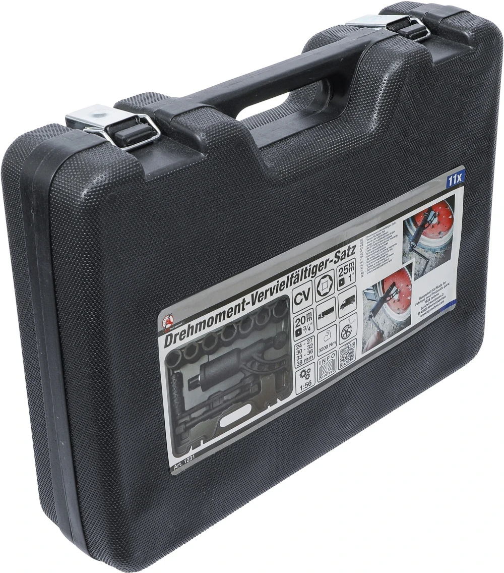 BGS DIY 1231 Satz Drehmoment Vervielfältiger Antreib 25mm (1") 3200Nm Beschreibung: zum Lösen festsitzender Radmuttern bei LKW und Transportern Übersetzung 1:56 inklusive 7 Einsätzen aus Chrom-Vanadium-Stahl Steckschlüssel-Einsätze, Antrieb Innenvierkant 25 mm (1"), Abtrieb Sechskant SW 24 – 27 – 30 – 32 – 33 – 36 – 38mm Technische Daten: Abtriebsprofil: Sechskant Antriebsprofil: Innenvierkant Antriebsprofilgröße, imperial: 1" Antriebsprofilgröße, metrisch: 25mm Bruttogewicht: 11540g Material: Chrom-Vanadium-Stahl Drehmoment max.: 3200Nm