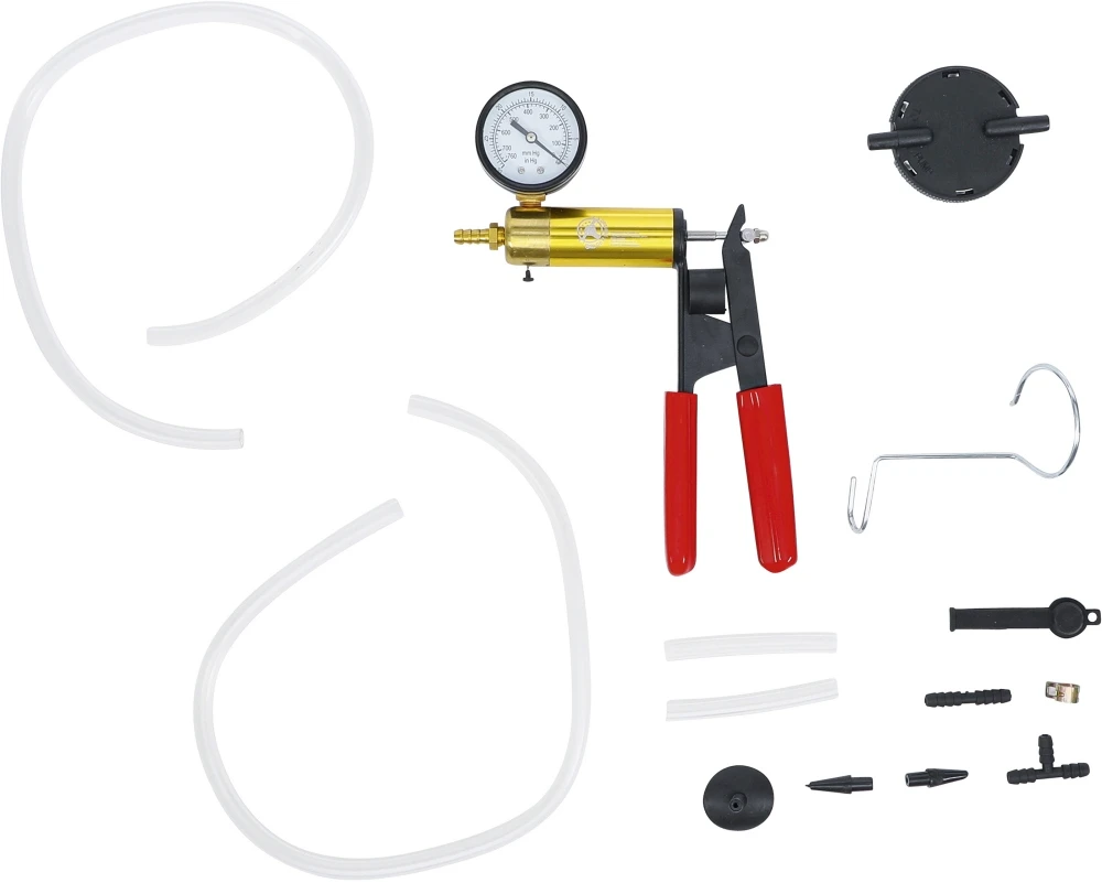 BGS DIY 8999 Vakuumpumpe / Bremsentlüfter maximal 0,7bar Beschreibung: zur Überprüfung von Bauteilen im Unterdrucksystem wie z. B. MAP-Sensoren, Ventilen, Schläuchen, etc. auch geeignet zum Entlüften von Brems- und Kupplungssystemen inkl. Verbindungsschläuche, Entlüftungsbehälter, Schlauchverbindern / Adaptern, Metallhaken max. Unterdruck 0,7 bar