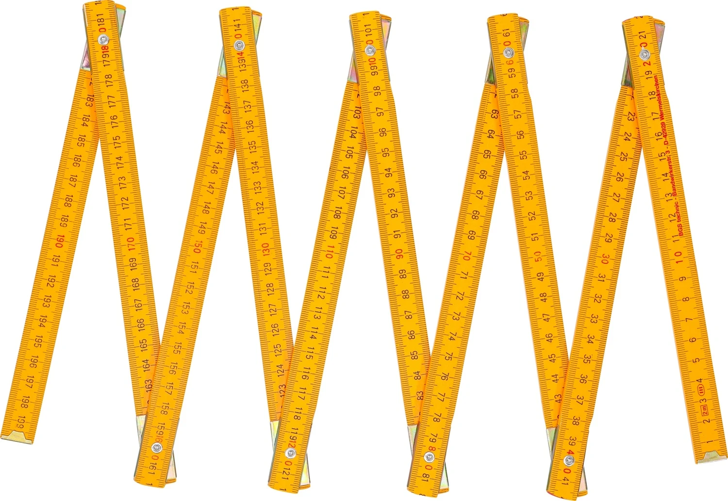 BGS DIY 92051 Gliedermaßstab aus Holz Länge 2m Beschreibung: zum Einsatz auf Baustellen, in der Werkstatt, im Haushalt und vielem mehr mit innenliegenden Stahlfederzungen und Gelenkplatten durchgenietete Gelenke Metallenden am Anfangs- und Endglied für erhöhte Robustheit einrastbar in einer 90° abgewinkelten als auch in einer ausgefalteten 180° Position um einen rechten Winkel bzw. eine gerade Linie zu erhalten mit beidseitiger mm-Teilung an Ober- und Unterkante Skalenteilung in schwarz mit großen dunkel gedruckten Dezimalzahlen durchgehend gelb lackiert zum leichten Auffinden im Werkzeugkoffer Genauigkeitsklasse: III Gliederzahl: 10 Gesamtlänge: 2-8m Material: Holz, Birke