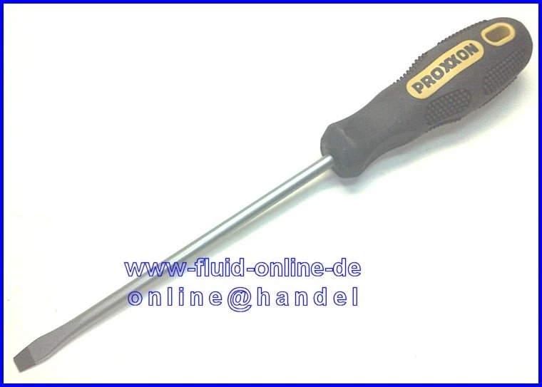 PROXXON 22016 FLEX DOT Schraubendreher Schlitz 6,5 x 150mm PROXXON Nummer: 22016 Beschreibung: Schlitz Schraubendreher Öl- und säurebeständige Gummi-Grifffläche mit Noppen professionelle Zwei-Komponenten-Griffgestaltung mit ergonomischem Design für eine ermüdungsfreies und angenehmes Arbeiten mit Loch zum Aufhängen Material: Chrom-Silicium-Mangan-Molybdän legierter Spezialstahl S2 technische Angaben: Gesamtlänge: 260 mm Klingenlänge: 150 mm Schlitz: 6,5 mm Dieser Schraubendreher ist auch im PROXXON Schraubendreher Satz 22604 enthalten