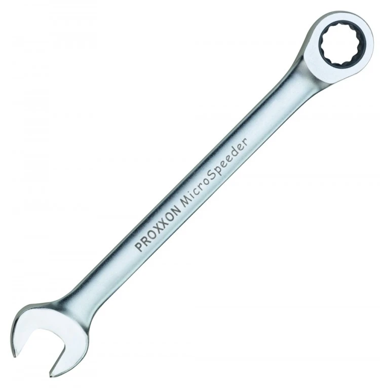 PROXXON 23133 MicroSpeeder 11mm Ratschen-Ringmaulschlüssel 15° Abwicklung Proxxon-Nummer 23 133 Beschreibung: Extrem schlanke Ausführung, besonders für Engraummontage geeignet Geschmiedete Ausführung Schaft aus CrV-Stahl, verchromt, mattiert, mit hautfreundlicher Oberfläche (Satin-Finish). Größenangabe mittels Laserbeschriftung 5°-Abwinklung ringseitig (vorteilhaft beim Schrauben auf Planflächen) Durch den 72-zahnigen Innenring aus hochlegiertem Spezialstahl erfolgt der Antrieb bereits bei einer Hebelbewegung von 5°. Dennoch liegen die übertragbaren Drehmomente weit über DIN/ISO Vor allem für den Fall, wenn es extrem eng wird: an Hinterachsen-Streben, Bremssätteln, Automatik-Getrieben (wenig Platz zwischen Getriebe und Tunnelwand), zum Motorausbau, Arbeiten an der Karosserie, zum Luftfilter-Ausbau diese Serie hieß früher mal "Combispeeder" technische Angaben: Schlüsselweite 11mm feinverzahnt mit 72 Zähnen Länge: 165mm Rechts-/Linksumschaltung auf der Ringseite verchromt, mattiert gelaserte Beschriftung Abwinklung ringseitig um 15°