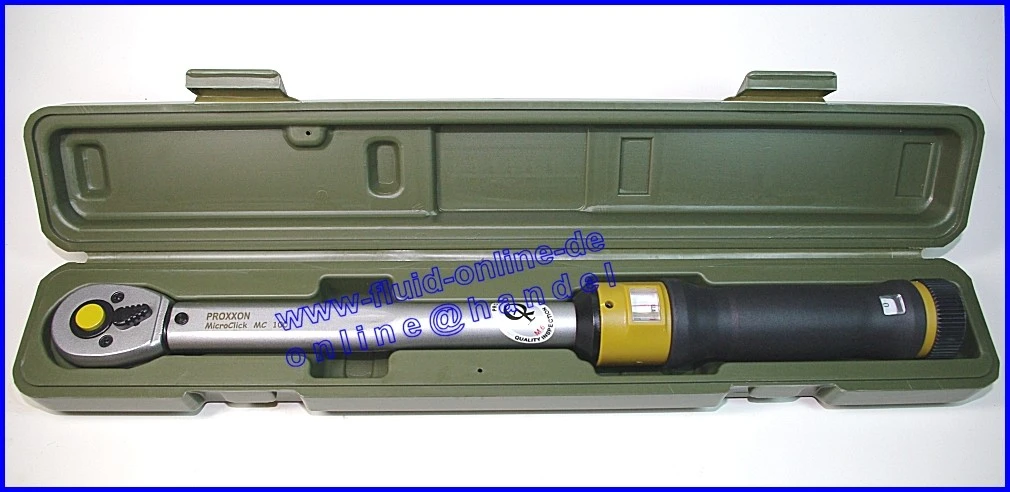 PROXXON 23351 Drehmomentschlüssel MC100 Meßbereich: 20 – 100 Nm Antrieb 10mm (3/8")PROXXON Nr. 23 351 Beschreibung: Automatisch auslösender Drehmomentschlüssel einfacher Umschaltmechanismus für Anziehen- und Lösen von Schrauben / Muttern Ratschen-Funktion mit Umschaltmechanismus zum Lösen von Schrauben ohne Werkzeugwechsel Stabiler, ovaler Schaft mit optimalem Rostschutz (2 x vernickelt und mattverchromt) Automatische Kurzauslösung: deutlich hör- und spürbarer "Click" beim Erreichen des vorgewählten Drehmomentwertes das Einstellen des Drehmomentwertes erfolgt über den Handgriff und wird durch den verschiebbaren Arretierring gesichert Technische Angaben: Messbereich / Anzugsbereich 20 – 100 Nm Drehmomenteinstellung in 0,5 Nm genau (z. B. 24,5 Nm) Genauigkeit +/- 3% (mit Bezug auf den Skalenendwert) Antrieb 10mm (3/8") Vierkant Gesamtlänge: 420mm Links- / Rechtsumschaltung Drehmomentauslösung bei Rechtslauf (also für alle "normalen" Schrauben / Muttern, die beim Anzug nach rechts gedreht werden) Lieferumfang: Drehmomentschlüssel PROXXON MC 100 Aufbewahrungskasten aus Hartplastik (Abmass Länge 455 mm x Höhe 60mm x Tiefe 70mm) deutsche Bedienungsanleitung (mehrsprachig) Anwendungsbereich Motorrad PkW LkW Maschinen Motoren, Zylinderkopf, Pumpen Bike Quad Hinweis: Nicht geeignet zum Anziehen von Felgen – hier werden höhere Anzugsmomente benötigt – dazu eignet sich der Proxxon MC200 Nummer 23353 am besten der Kopf ist nicht abnehmenbar
