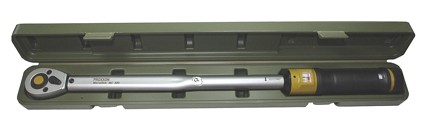 PROXXON 23354 Drehmomentschlüssel MICRO-Click MC320PROXXON Nr. 23 354 Meßbereich: 60 – 320 Nm Beschreibung: Automatischer Drehmomentschlüssel einfacher Umschaltmechanismus für Anziehen- und Lösen von Schrauben / Muttern Ratschen-Funktion mit Umschaltmechanismus zum Lösen von Schrauben ohne Werkzeugwechsel Stabiler, ovaler Schaft mit optimalem Rostschutz (2 x vernickelt und mattverchromt) Automatische Kurzauslösung: deutlich hör- und spürbarer "Click" beim Erreichen des vorgewählten Drehmomentwertes das Einstellen des Drehmomentwertes erfolgt über den Handgriff und wird durch den verschiebbaren Arretierring gesichert Technische Angaben: Messbereich / Anzugsbereich 60 – 320 Nm (in einige Katalogen steht noch ein Messbereichab 50 Nm, dass ist falsch) Drehmomenteinstellung auf 2 Nm genau (z. B. 164 Nm) Genauigkeit +/- 3% (mit Bezug auf den Skalenendwert) 12,5mm (1/2") Antrieb, Vierkant Gesamtlänge: 600mm Links- / Rechtsumschaltung Drehmomentauslösung bei Rechtslauf (also für alle "normalen" Schrauben / Muttern, die beim Anzug nach rechts gedreht werden – nicht für Linkslauf geeignet) Lieferumfang: Drehmomentschlüssel PROXXON MICRO-Click MC320 Aufbewahrungskasten aus Hartplastik (Abmass Länge 620 mm x Höhe 65mm x Tiefe 70mm) deutsche Bedienungsanleitung (mehrsprachig) Anwendungsbereich Motorrad PkW LkW Maschinen Motoren, Zylinderkopf, Pumpen Bike Quad Hinweis: der Kopf ist nicht abnehmenbar