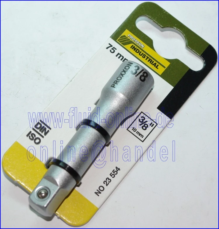 PROXXON 23554 Verlängerung Länge 75mm Antrieb 10mm (3/8") PROXXON Nr. 23 554 Beschreibung: Länge: 75mm Anschluß: beidseitig 10mm (3/8")