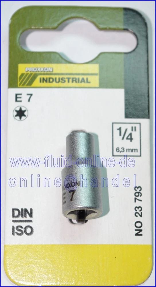 PROXXON 23793 Aussen Torx Einsatz Nuss E7 Antrieb 6,3mm (1/4') PROXXON Nummer 23 793 Beschreibung: Größe: E7 Antrieb: 6,3mm (1/4") Innenvierkant Material: CrV-Stahl 31 CrV3 geschmiedet Optimaler Oberflächenschutz: 2 x vernickelt und 1 x verchromt