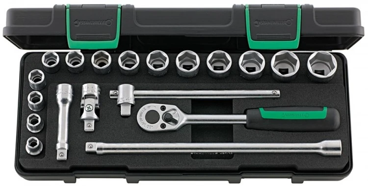 STAHLWILLE 456/14/5i – Steckschlüssel-Garnitur 10mm (3/8") Antrieb Stahlwille Code – 96023132 (vormals 96021132) Beschreibung im robusten, stapelbaren ABS-Kunststoffkasten 19-teiliger Satz Lieferumfang: je 1 x Nüsse Profil Sechskant Serie 456 Antrieb 10mm (3/8") in den Größen: 8 – 9 – 10 – 11 – 12 – 13 – 14 – 15 – 16 – 17 – 18 – 19 – 21 – 22mm 1 x Knarre Serie 435 mit 10mm (3/8") Antrieb 1 x Verlängerung Länge 76mm Serie 427/3 1 x Verlängerung Länge 240mm Serie 427/10 1 x Quergriff Serie 425 1 x Kardangelenk Serie 428