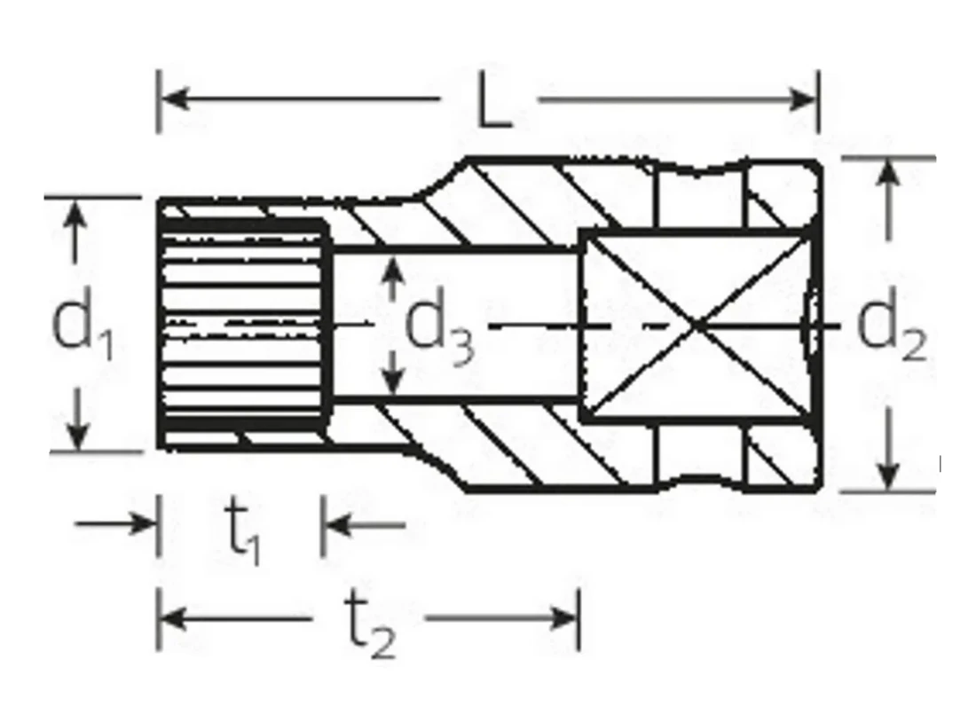 STAHLWILLE 45aSp Spline-Drive Nuss Gr. 12 Antrieb 10mm (3/8") Stahlwille Code 02011012 Beschreibung: für Außen Spline-Drive-Schrauben MS-33787, MIL-W-8982 HPQ®-Hochleistungsstahl, extrem belastbar, dennoch dünnwandig und ideal für Arbeiten bei engen Platzverhältnissen verchromt Technische Daten: Code 02011012 Spline Gr. 12 Schlüsselweite (Zoll) 3/8" d1 mm 13,7 d2 mm 16,5 d3 mm 8,6 L 26,5 t1 9 t2 15 Gewicht g 24