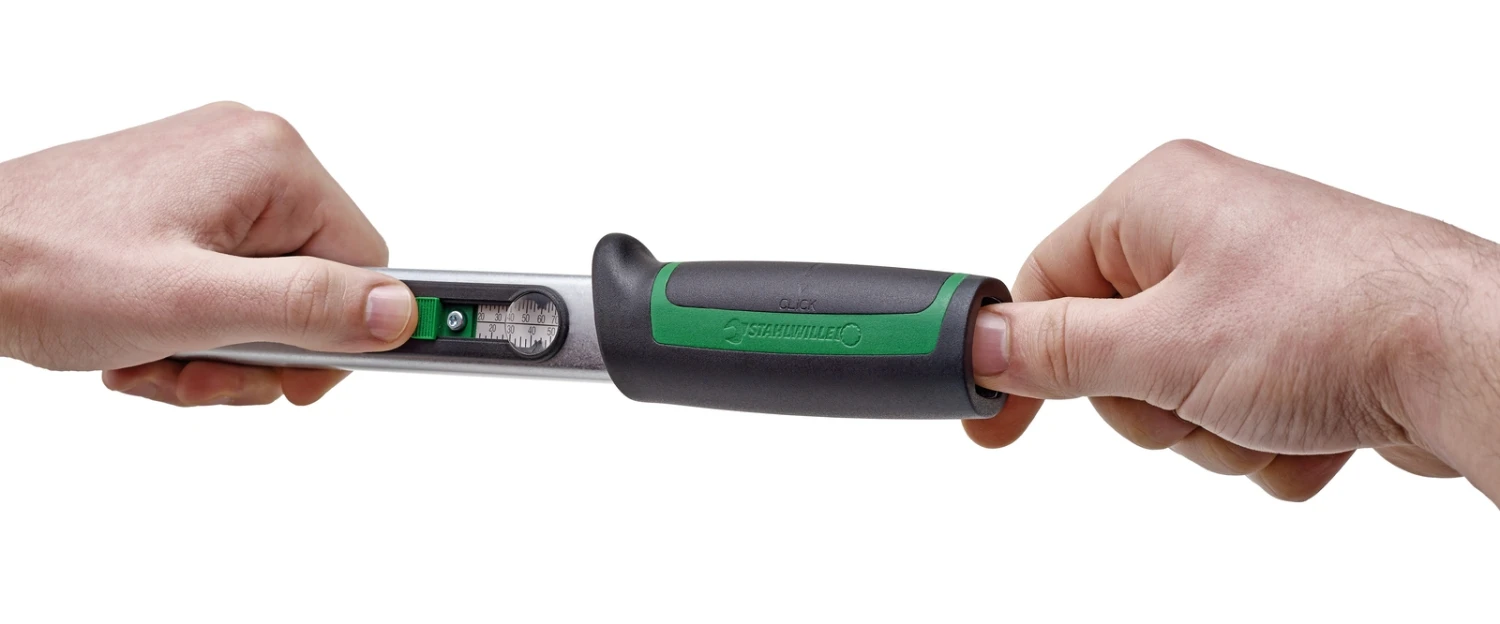 STAHLWILLE 721/30 QUICK Drehmomentschlüssel mit festeingebauter Knarre Manoskop 60-300 Nm STAHLWILLE Code 50204030 Beschreibung: auslösender Drehmomentschlüssel kein Rücksetzen auf "0" erforderlich, da Messelement nur beim Anziehvorgang belastet wird Blitzeinstellung durch leicht zu betätigenden Klemmhebel im Griff ergonomisch geformtes, abrutschsicheres Verstellelement mit Daumenmulde integrierte Lupe im Ablesefenster optimierter Ballengriff für ermüdungsfreies Arbeiten Doppel-Stopp-Signal Doppelskala N·m/ft·lb Weiterbelastung nach dem Auslösen oder Belastungen entgegen der Funktionsrichtung, z. B. bei festsitzenden Schrauben, wirken nicht auf den Auslösemechanismus, der dadurch vor Beschädigung geschützt wird. Schutz aller empfindlichen Teile durch das robuste Stahlrohrgehäuse Kalibrierung mit der perfectControl® Kalibriereinrichtung Nr. 7794 oder der Kalibrieranlage Nr. 7706. Ggf – Nachjustieren ohne Demontage. Zertifikat gemäß DIN EN ISO 6789-2:2017 Anzeigeabweichung ± 4 % Technische Daten Drehmomentschlüssel: Code 50204030 EAN Code 4018754268948 EClass 5.1 21040222 Gewicht g 1646 Länge mm 555 Breite mm 46 b1 mm 28 b2 mm 44 Nennwert 300 N·m Skalen-Teilung (E1) 10 N·m Skalen-Teilung (E2) 10 ft·lb Abtriebsvierkant außen (Zoll) 1/2" Größe 30 Skalen-Bereich 60-300 N·m Skalen-Bereich 50-220 ft·lb Zur Info, für die, die nur einen Ersatzteilsatz suchen: passender Ersatzteilsatz: STAHLWILLE 7210/30 Ersatzteil Satz für Drehmomentschlüssel 721/30 – 59191030
