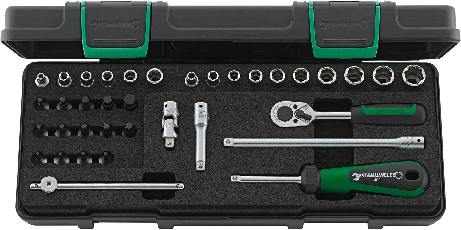 STAHLWILLE 88TX – Torx-Garnitur Antrieb 6,3mm (1/4") Stahlwille Code – 98819801 (vormals 98818801) Lieferumfang: im robusten, stapelbaren ABS-Kunststoffkasten 36 teilig Lieferumfang: je 1 x Nüsse / Steckschlüsseleinsätze mit Sechskantprofil, Serie 40 in den Größen: 5 – 5,5 – 6 – 7 – 8 – 9 – 10 – 11 – 12 – 13mm je 1 x Nüsse / Steckschlüsseleinsätze für Außen TORX®-Schrauben, Serie 40TX in den Größen: E4 E5 – E6 – E7 – E8 – E10 je 1 x INHEX-Einsätze Serie 44K HX3 – HX4 – HX5 -HX6 HX8 je 1 x Bits / Schraubendrehereinsätze für Innen TORX®-Schrauben ohne Bohrung, Serie 44KTX in den Größen: TX8 – TX9 – TX10 – TX15 -TX20 – TX25 – TX27 – TX30 – TX40 1 x Knarre / Ratsche Antrieb 6,3mm (1/4") Serie 415 1 x Verlängerung Serie 405/2, Länge 54mm 1 x Verlängerung Serie 405/6, Länge 150mm 1 x Kardangelenk Serie 407 1 x Steckgriff Serie 400 1 x Quergriff Serie 404 Technische Daten: Länge: 325mm Breite: 135mm Höhe: 60mm Gewicht: 1190g